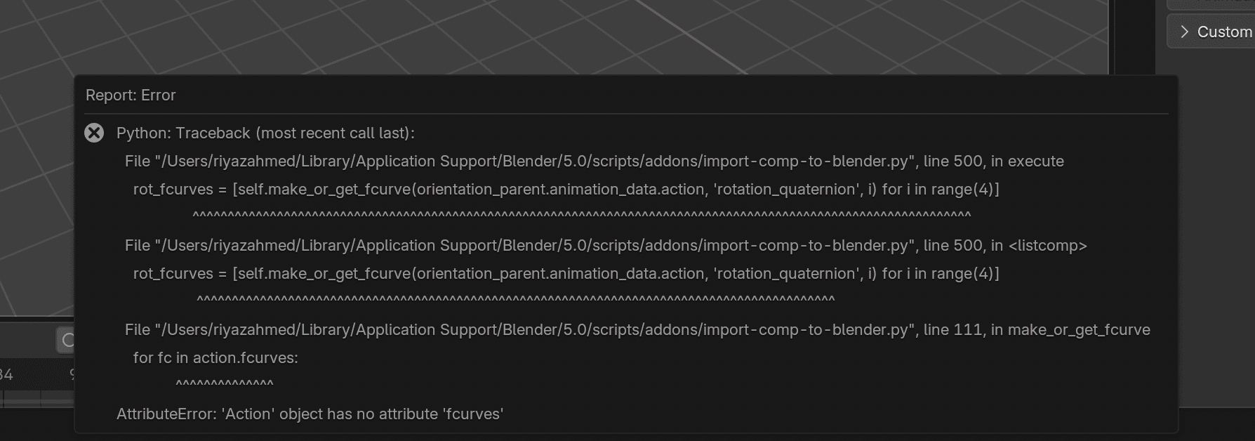 I am encountering this error every time I upload my data from After Effects 26 into Blender version 5. I would like to know whether this issue is caused by compatibility problems with the latest versions of both software, or if I may be doing something incorrectly.